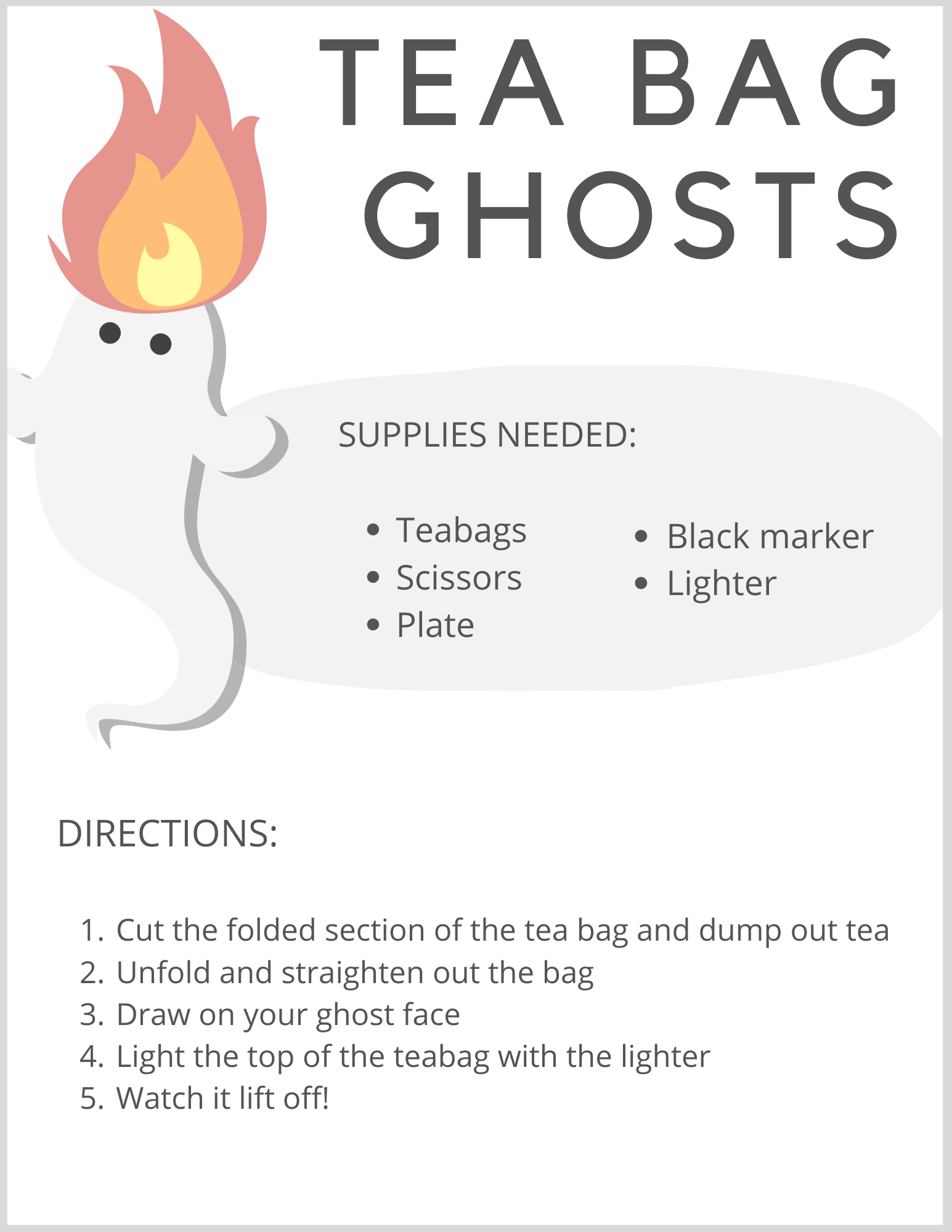Tea Bag Ghosts – Watch tea bags lift-off while explaining the science behind exothermic reactions! This is also a great time to explore the scientific method.