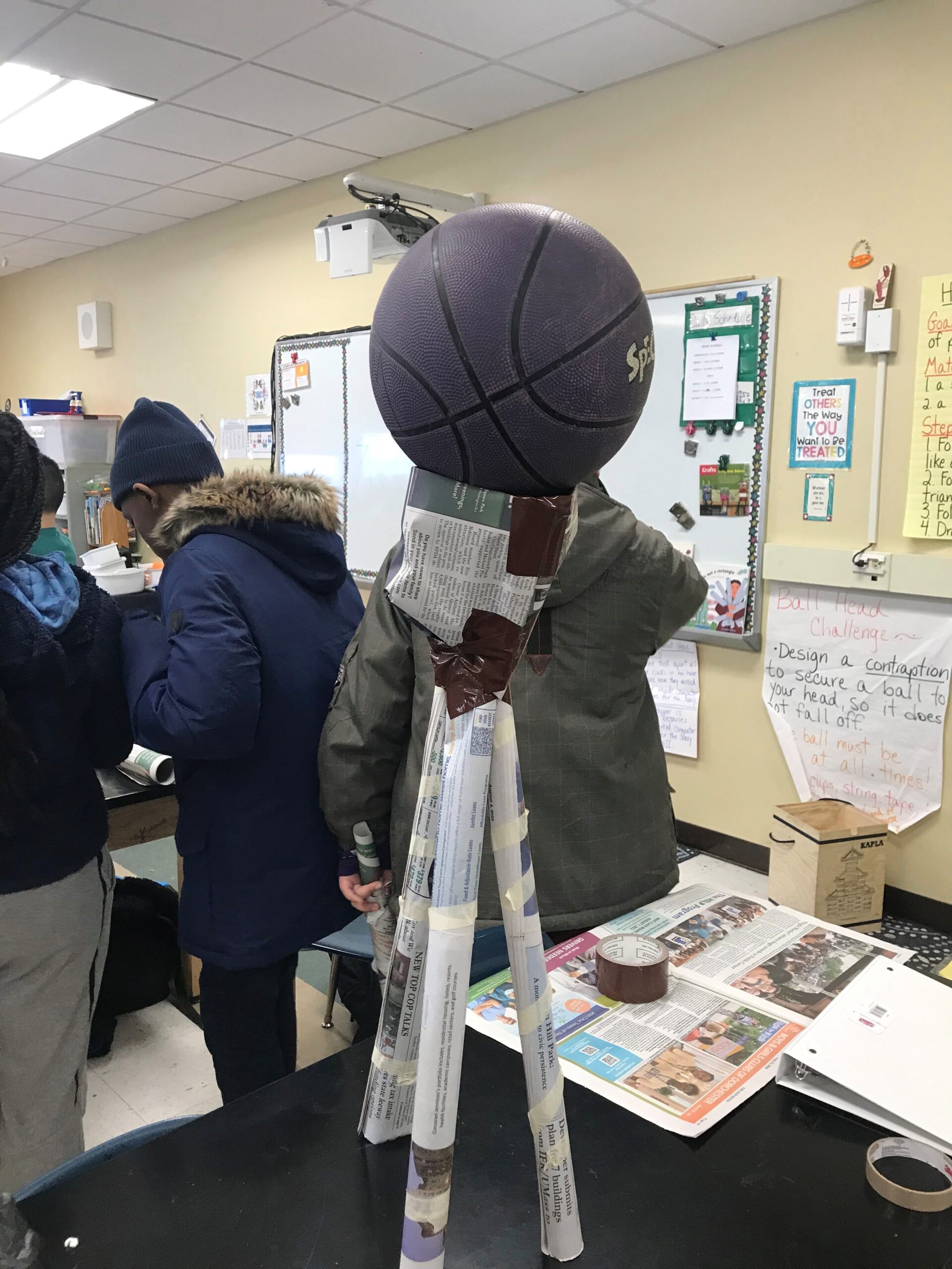 The students enjoy planning for the building of the tower out of just newspaper and tape. The students plan accordingly using the engineering design process. Students then begin the process of the challenge by building a tower to support the weight of a basketball, with the constraints of only using newspaper and tape and finally finding success by finding out if their tower can support a basketball for 20 seconds. If they need to make improvements to their product, they have an opportunity to redesign and try again.